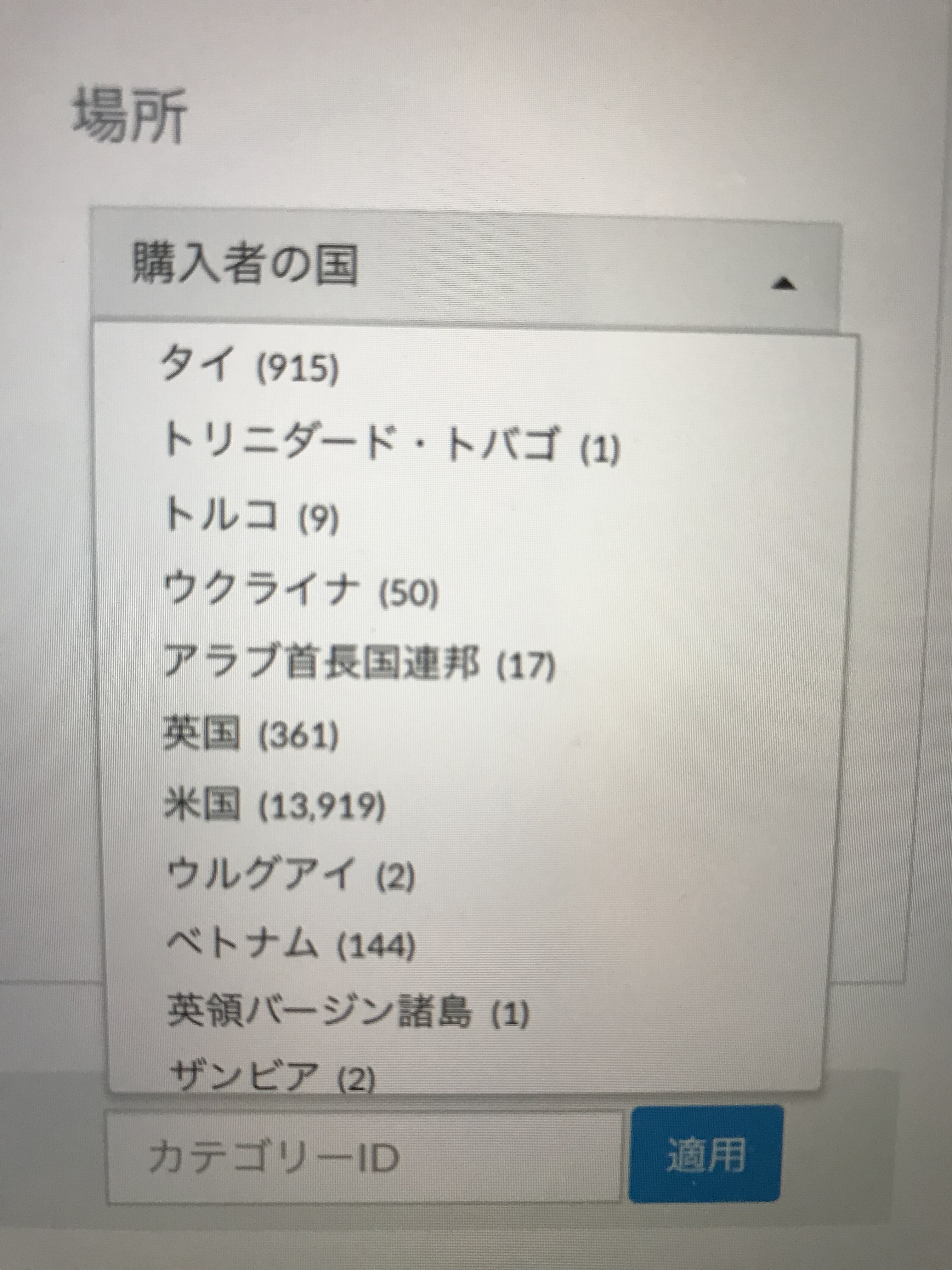 アメリカの人が購入したのが13919と圧倒的に多いですが、